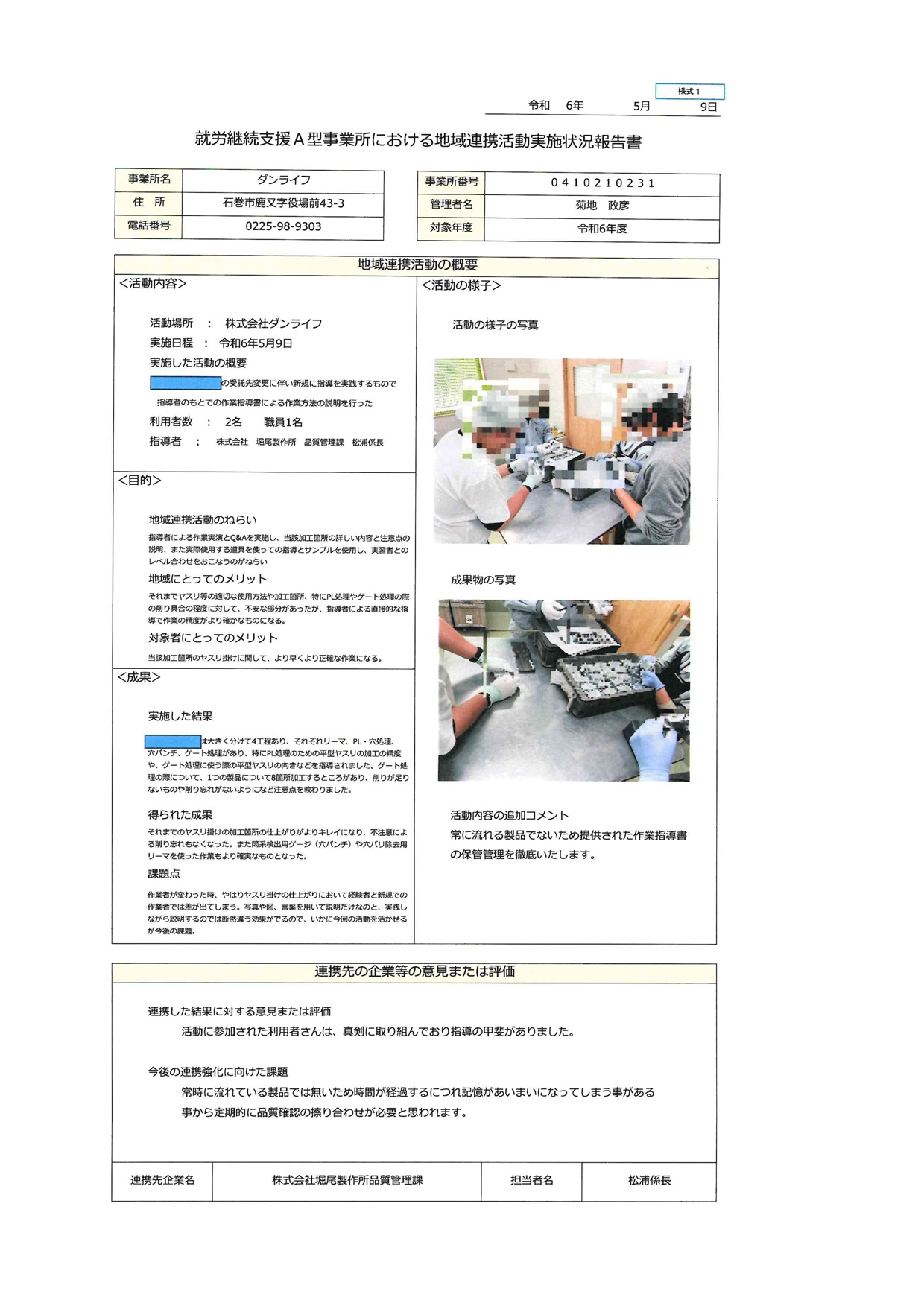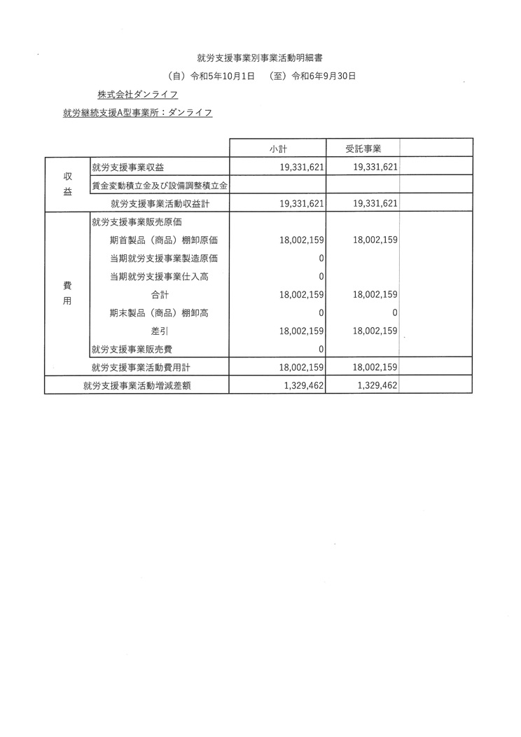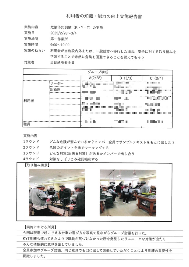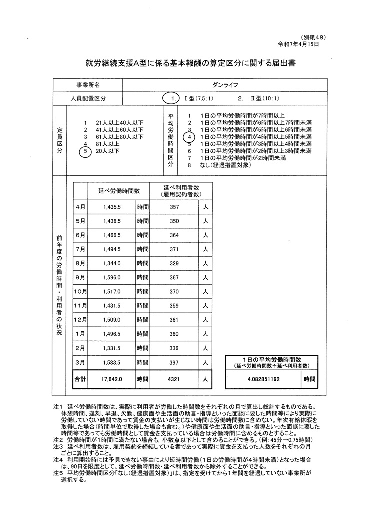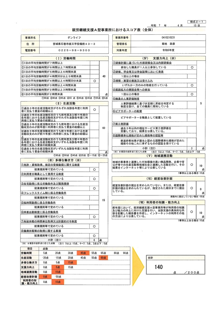 就労継続支援A型事業所におけるスコア表(全体)様式2-1 Ⅰ 労働時間 40点 ■1日の平均労働時間 4時間以上4時間30分未満 Ⅱ 前年度及び前々年度における生産活動収支の状況 40点 Ⅲ 多様な働き方 15点 様式2-2のとおり 就業規則にて定めております。 Ⅳ 支援力向上 5点 評価要素 実施状況 ①研修計画に基づいた外部研修又は内部研修 ②視察、実習の実施又は、受け入れ ④拡販拡大の商談会等への参加 〇 Ⅴ 地域連携活動 10点 Ⅵ 経営改善計画 0点 経営改善計画を求められていない Ⅶ 利用者の知識・能力向上 KYT活動の実施